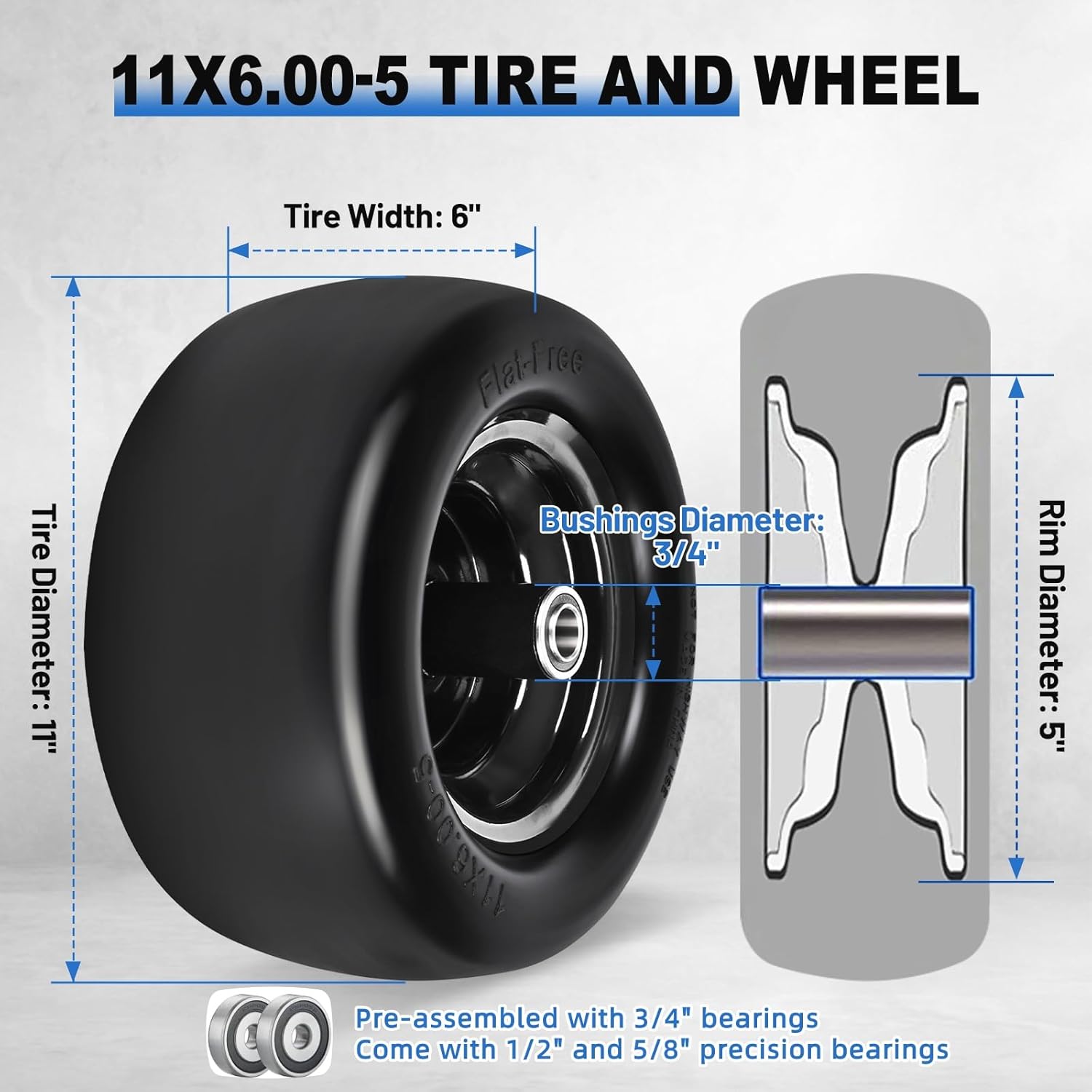 | Included Components | 1-pack of 11x6.00-5 Flat Free Tire, 2Pcs x 1/2" precision bearings and 2Pcs x 5/8" precision bearings, 4Pcs x 0.4" metal spacer and 2Pcs x 0.24" metal spacer, 6Pcs x 0.47" wheel spacers and 2Pcs x 0.24" wheel spacers |