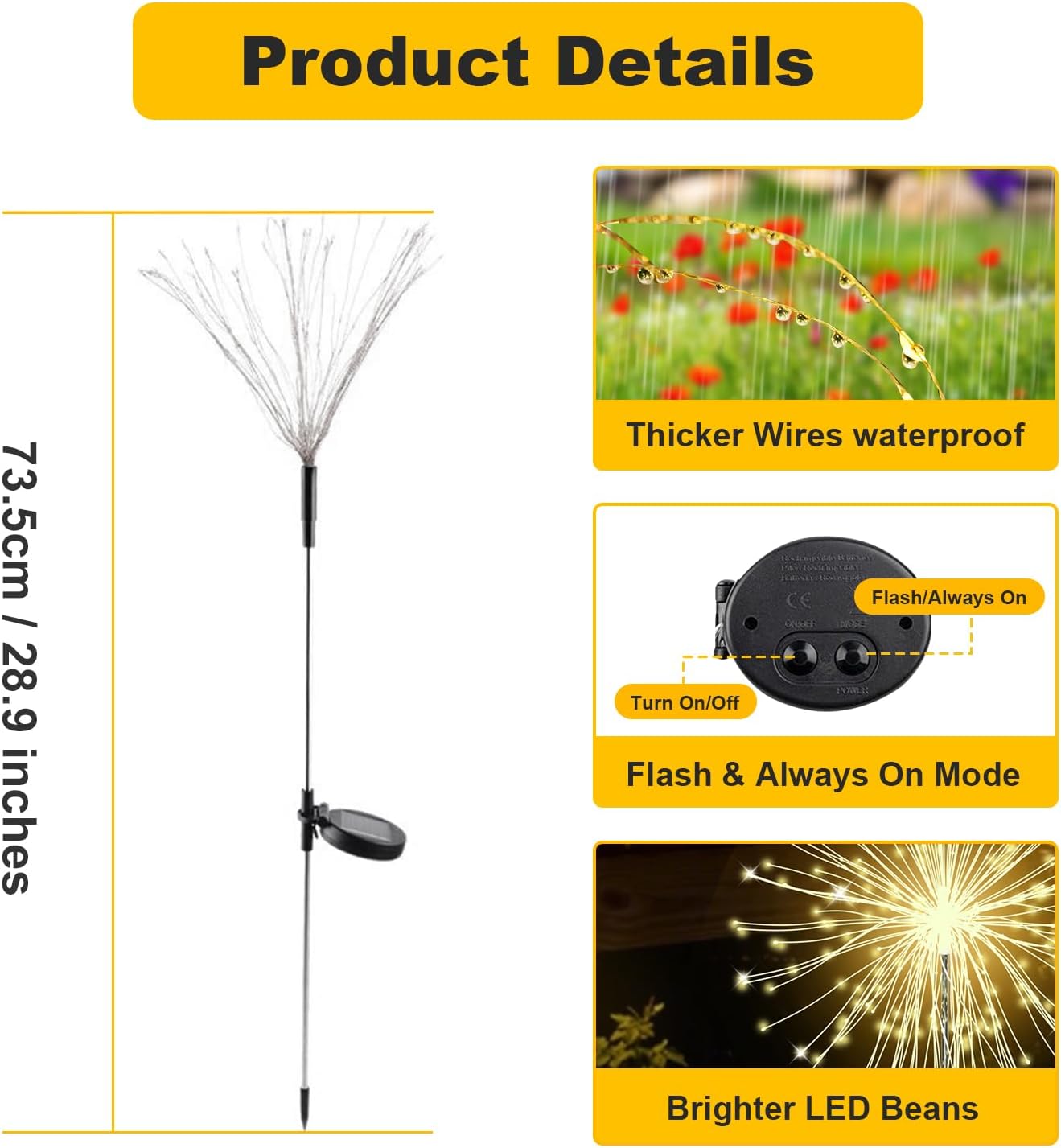 Each of these solar-powered lights is equipped with 120 high-quality LED beads, allowing you to easily switch between dynamic twinkling and steady lighting modes with a single button. Perfect for decorating garden paths, yard corners, balcony planters, and festive parties, they infuse your home environment with a uniquely romantic and artistic charm. The flexible copper wire body and high-transparency LED beads enable free shaping—effortlessly creating starbursts, hearts, flowers, and various other patterns to unleash your creativity. Ideal not only for gardening enthusiasts but also for holidays like Halloween, Christmas, and New Year’s, these lights effortlessly set the mood for any occasion.Featuring an upgraded solar panel and a 1.2V/600mAh rechargeable battery, just 4–6 hours of sunlight fully charges the lights for 8–10 hours of illumination at night. The energy-efficient LEDs emit low heat, are eco-friendly, and have a long lifespan. With smart light control, these lights are ready to use straight out of the ground—automatically turning on at dusk and off at dawn. No wiring required, zero electricity costs!Built with a corrosion-resistant structure, rainproof design, and sturdy in-ground stakes, these lights withstand harsh outdoor weather conditions. A high-quality, high-value solar decorative lighting solution. Specification: Type: Solar In-Ground Firework Light Solar Panel: 5.5W Polycrystalline Silicon Light Source: LED Material: PVC + Metal Working Mode: Smart Light Control Size: 73.5cm / 28.9 inches Light Source Power: 20W