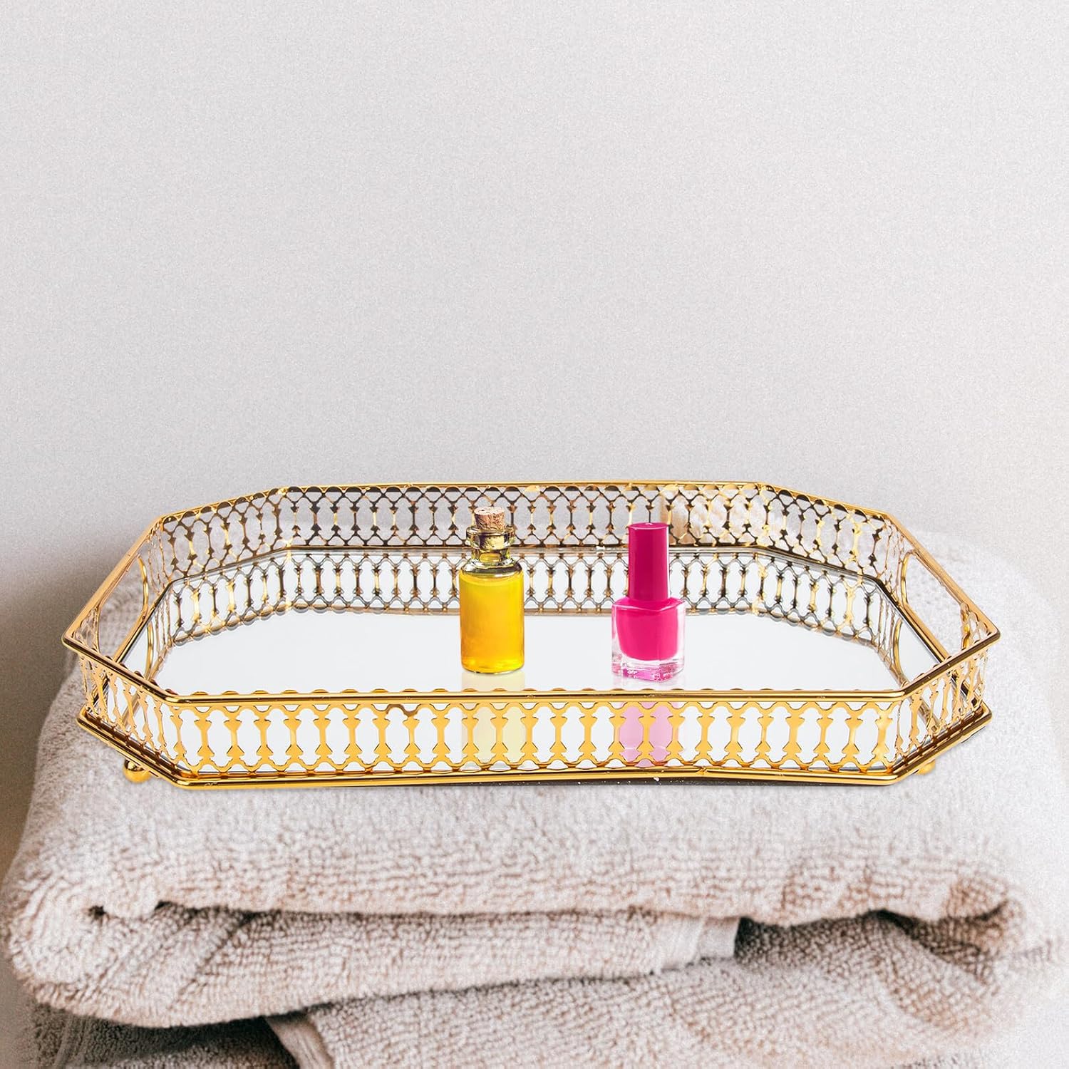Package Include 1 x toiletries tray Features -Product Info:Washing supplies tray -Size: About 35.00X25.00X3.80cm/13.76X9.82X1.49inch -Material: Metal, glass -Color: Golden -The metal material and good workmanship make it easy to clean and not easy to break. -It has a wide range of uses, suitable for places such as study rooms, living rooms, bedrooms, hotels, etc storage tray. -You can use it to store all your small jewelries or some other items to make your toilet and dresser tidy and well- organized Bathroom Storage Plate. -Simple and generous, the shape design and the grain design is reasonable, beautiful and practical home bathroom tray. -Made of mild and material, comfortable and safe, you can use it with confidence.Goods Descriptionbathroom tray metal It is made with a reasonable design and has a suitable volume, practical and convenient for storage use.bathroom vanity tray This is an excellent desktop storage tray that will meet your needs well.home bathroom tray This is a home storage tray, made of safe and gentle material, with a smooth texture, and practical, and it can provide you with excellent finishing and storage effects