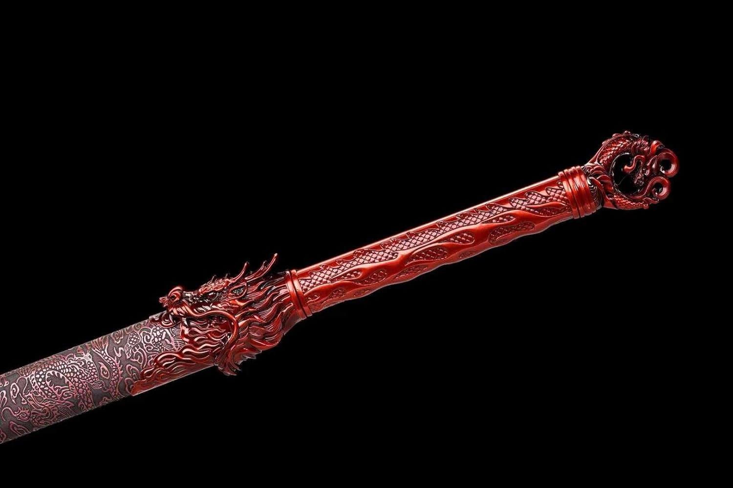 The blade of this sword is made of high carbon steel. The high-performance blade has very good toughness and does not deform when bent at 90 degrees. The hardness is as high as 58. We would highly recommend it as a gift. Anyone would be thrilled to receive a gorgeous sword as a gift! GENERAL DATA OVERALL LENGTH: 111 cm / 43.7 inch BLADE LENGTH: 71 cm / 28 inch HANDLE LENGTH: 30 cm / 11.8 inch BLADE WIDTH: 3.8 cm / 1.5 inch BLADE THICKNESS: 0.5 cm / 0.2 inch BLADE CRAFT: fully hand forged, water quenching BLADE MATERIAL: high carbon steel, electroplated red surface BLADE HRC: 58 MOUNTINGS TSUKA(HANDLE): alloy FITTINGS: alloy SAYA: wooden scabbard wrapped by PU leather PACKAGE 1 sword with saya (No display stand or other fittings along with)🥷🏿MAINTENANCE - 1, do not touch the blade with your hand to avoid cuts or rust due to sweat corroding the blade. 2, do not cut hard objects such as stones, wires, so as not to cause damage to the blade (splattered debris may also hurt people). 3, Third, clean the blade regularly and apply a thin layer of maintenance oil to stop the blade from oxidizing with moisture in the air and causing rust.